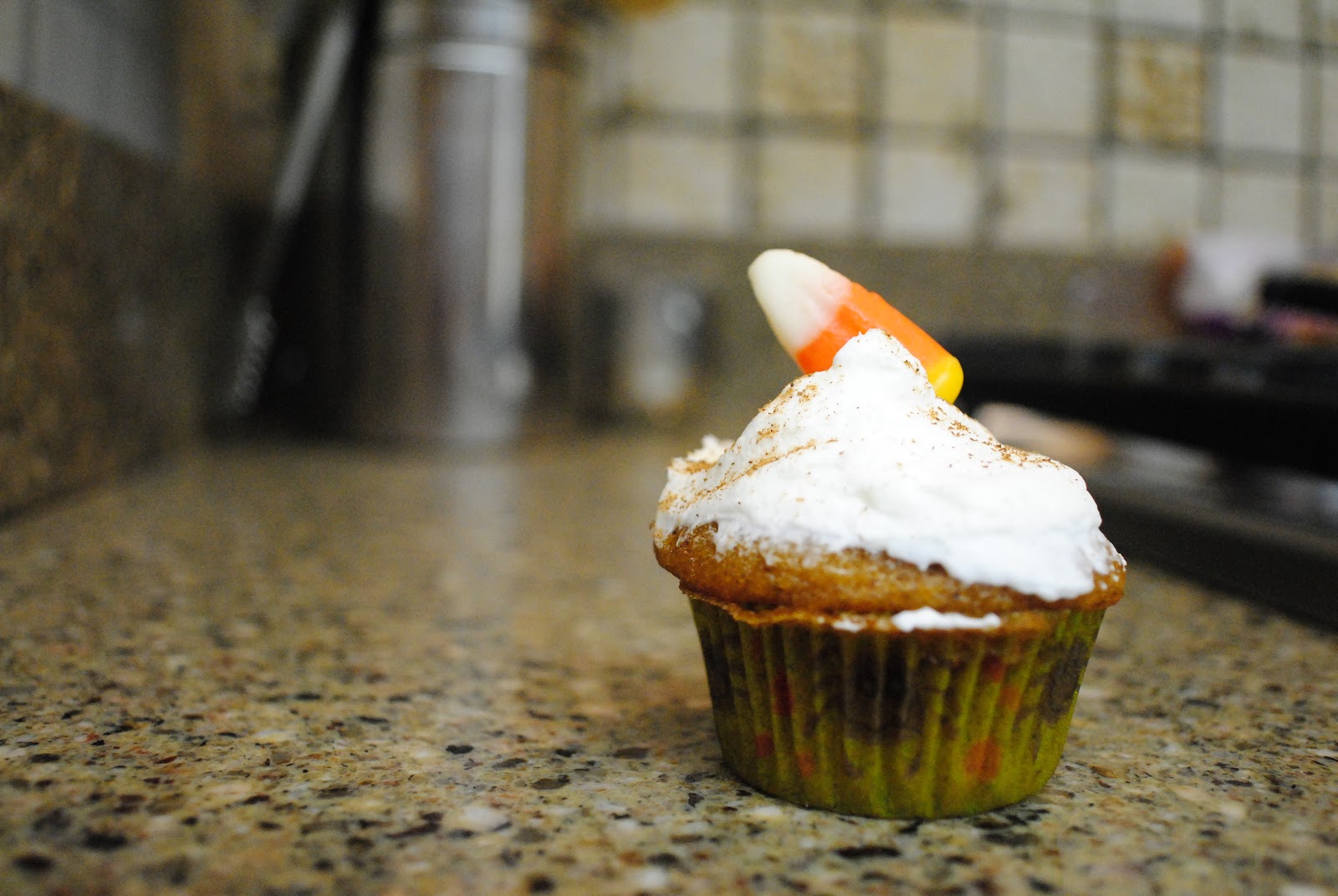 I put some of this on those cupcakes, sprinkled them with a little bit of cinnamon, then topped them off with candy corn.