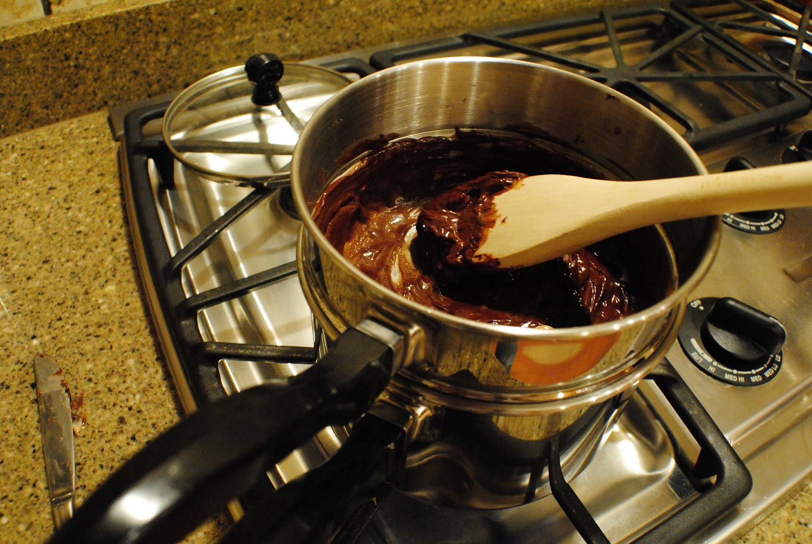 Then, heat water in a pot (or, if you're fancy like me, the bottom pot of your double boiler). Make sure that there's enough room above the water for a heatproof bowl to sit on top of your water-pot without having the bottom of the bowl touch the water.